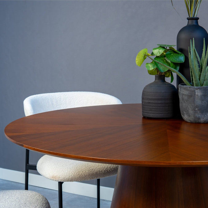 Dank seines klassischen und zeitgenössischen Looks passt der Adelaide Esstisch perfekt zu verschiedenen Einrichtungsstilen, egal ob Sie eine moderne, skandinavische, Boho oder traditionelle Einrichtung haben. Dieser Tisch fügt sich nahtlos in Ihre bestehende Einrichtung ein und bietet mit seiner runden Form mehr Flexibilität bei der Raumaufteilung. So können Sie bei der Anordnung von Stühlen und Accessoires kreativ sein. Die zusätzliche Walnusslackierung erhöht die Ausstrahlung und verleiht diesem schönen Esstisch einen zusätzlichen Hauch von Raffinesse.