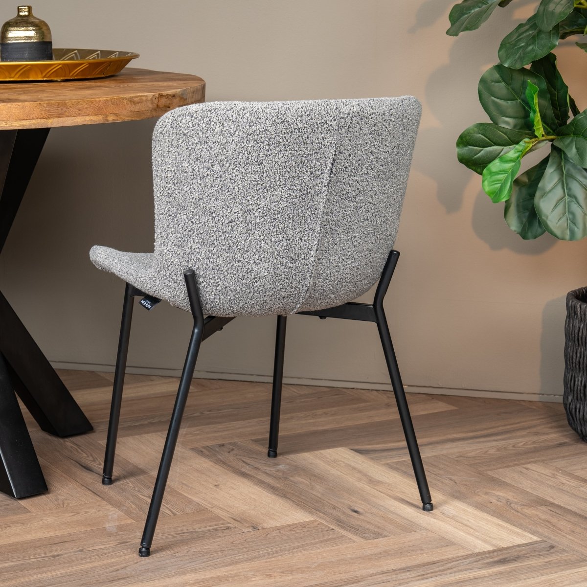Verleihen Sie Ihrem Esszimmer mit dem Esszimmerstuhl Lille in Hellgrau einen Hauch von Leichtigkeit. Die Bouclé-Stoffpolsterung in diesem dezenten Farbton schafft eine ruhige und entspannende Atmosphäre.