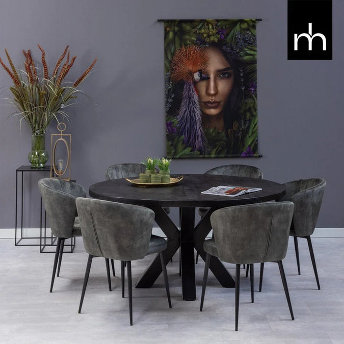 Samt wird aus Baumwolle oder Seide hergestellt. Der Stoff ist so gewebt, dass kleine, aufrechte Schlaufen entstehen. Diese Schlingen werden dann abgeschnitten, wodurch kleine Härchen entstehen, die sich sehr weich anfühlen. Dies verleiht dem Samt sein charakteristisches schickes Aussehen. Die Beine bestehen aus schwarz pulverbeschichtetem Metall.