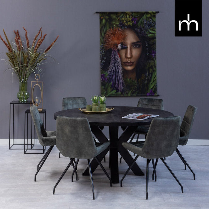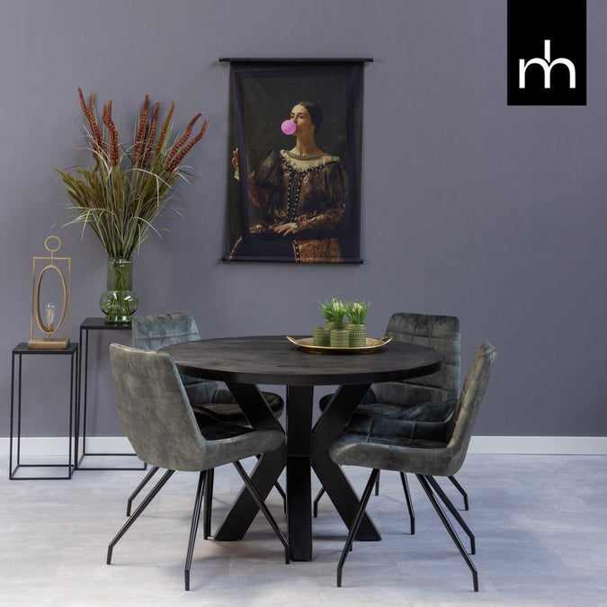 Samt wird aus Baumwolle oder Seide hergestellt. Der Stoff ist so gewebt, dass kleine, aufrechte Schlaufen entstehen. Diese Schlingen werden dann abgeschnitten, wodurch kleine Härchen entstehen, die sich weich anfühlen. Dies verleiht dem Samt sein charakteristisches schickes Aussehen. Die Beine bestehen aus schwarz pulverbeschichtetem Metall.