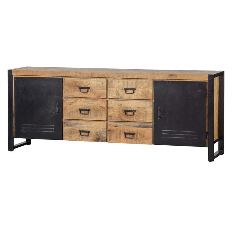 Ein robustes Anrichte mit Türen, die vom traditionellen Schließfachschrank inspiriert sind. Die Kombination aus warmem Mangoholz und schwarzem Stahl macht das Anrichte zu einer Bereicherung für Ihr Interieur. Das Anrichte bietet viel Stauraum in den sechs Schubladen und Doppelfächern hinter beiden Stahltüren.