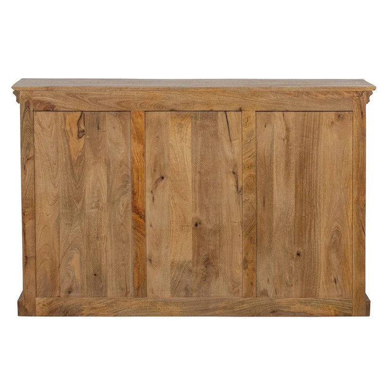 Auf das massive Mangoholz werden mehrere Schichten Holzöl und ein klares, natürliches Bienenwachs aufgetragen, um das Holz vor Feuchtigkeit, Schmutz und Ringen zu schützen. Die Schiebetür, Griffe und Schienen bestehen aus schwarz pulverbeschichtetem Metall.
