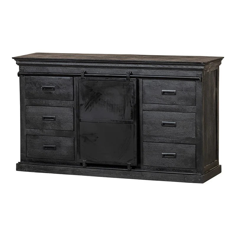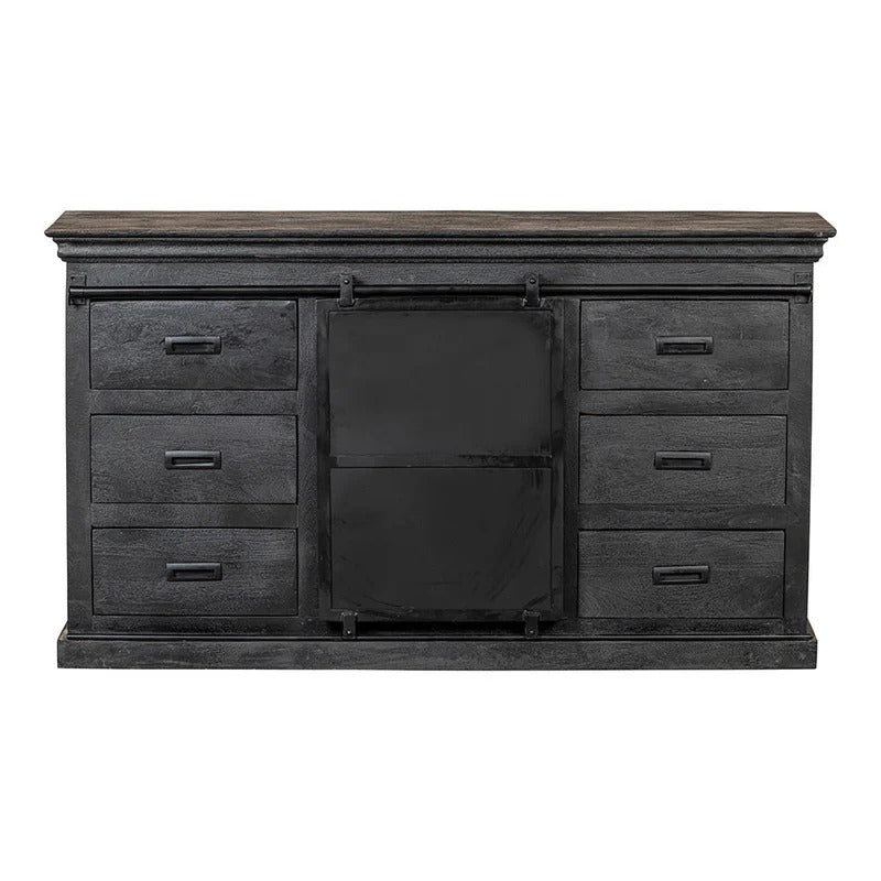 Die Mangoholz-Anrichten aus der Newark schwarz-Kollektion sind die neuesten ihrer Art! Dieses 140 cm breite Anrichte ist robust und stilvoll zugleich. Die schwarze Lackierung des Mangoholzes verleiht dem Anrichte ein äußerst luxuriöses Aussehen. Das Das Anrichte besteht aus sechs Schubladen mit zwei offenen Fächern in der Mitte, die durch eine Metallschiebetür abgedeckt werden, um alle Arten von Gegenständen aufzuräumen.