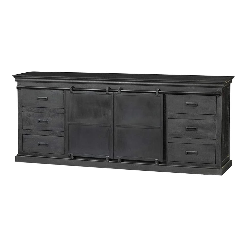 Das Mangoholz ist massiv und is zunächst sandgestrahlt, anschließend mit schwarzer Farbbeize behandelt und schließlich mit einem dunklen, natürlichen Bienenwachs veredelt, um das Holz vor Feuchtigkeit, Schmutz und Kreisen zu schützen. Die Schiebetüren, Schienen und Schubladengriffe bestehen aus schwarz pulverbeschichtetem Metall.