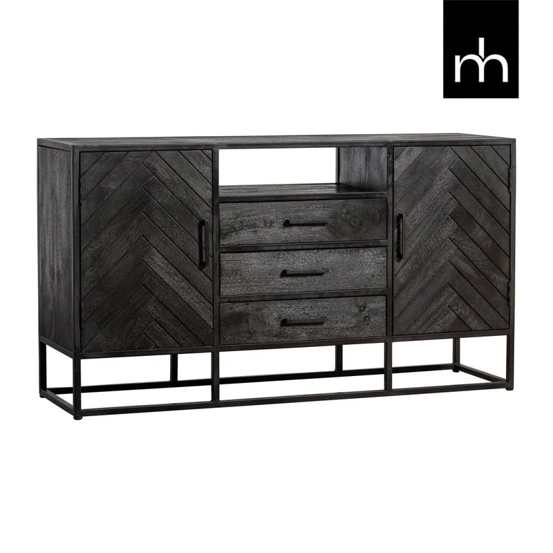 Das massive Mangoholz wird zunächst sandgestrahlt, dann mit schwarzer Farbbeize behandelt und abschließend mit einem dunklen natürlichen Bienenwachs veredelt, sodass das Holz vor Feuchtigkeit, Schmutz und Flecken geschützt ist. Der Rahmen und die Griffe bestehen aus schwarzem Stahl, der mit einer schwarzen Pulverbeschichtung versehen ist.