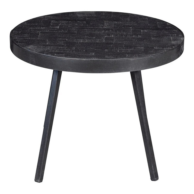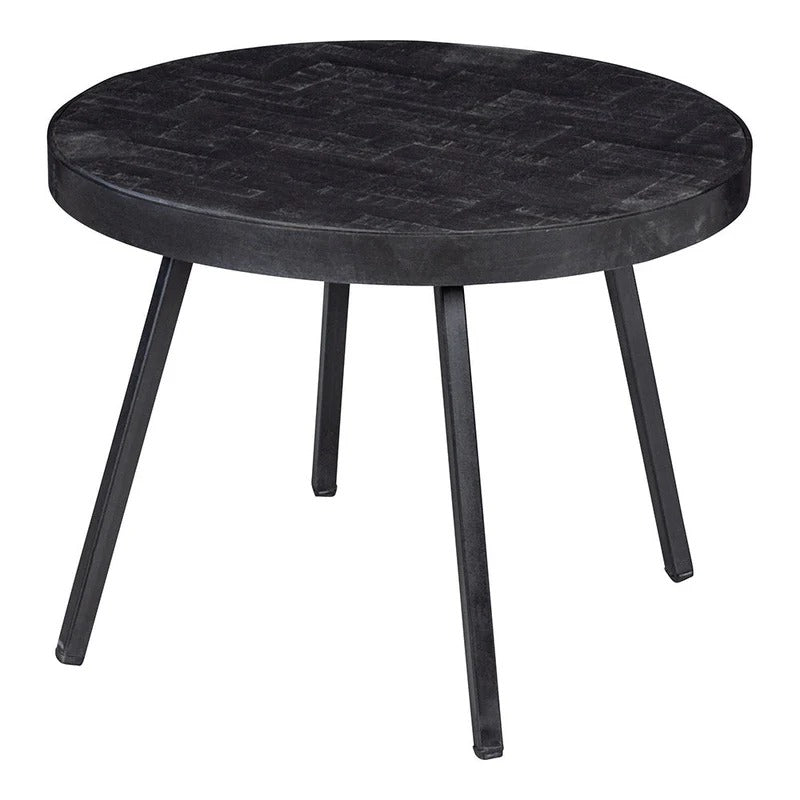 Die Platte des Couchtisches besteht aus massivem Mangoholz. Dieser wurde zunächst sandgestrahlt, dann mit schwarzer Farbbeize behandelt und mit einem dunklen, natürlichen Bienenwachs veredelt. Letzteres sorgt dafür, dass das Holz vor Feuchtigkeit, Schmutz und Ringen geschützt ist. Der Tisch lässt sich daher leicht mit einem leicht feuchten Tuch reinigen. Die Basis besteht aus vier Stahlbeinen mit einer schwarzen Pulverbeschichtung.