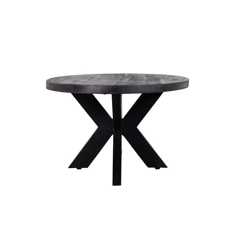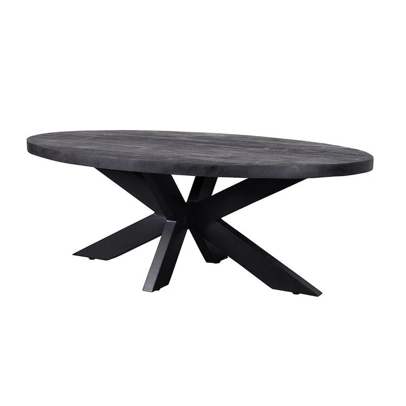 Die Mangoholzplatte ist massiv und hat eine Stärke von ca. 4 Zentimetern. Das Mangoholz wird zunächst sandgestrahlt, anschließend mit schwarzer Beize behandelt und abschließend mit einem dunklen, natürlichen Bienenwachs veredelt, um das Holz vor Feuchtigkeit, Schmutz und Flecken zu schützen. Die Spinnenbeine bestehen aus schwarz pulverbeschichtetem Metall.