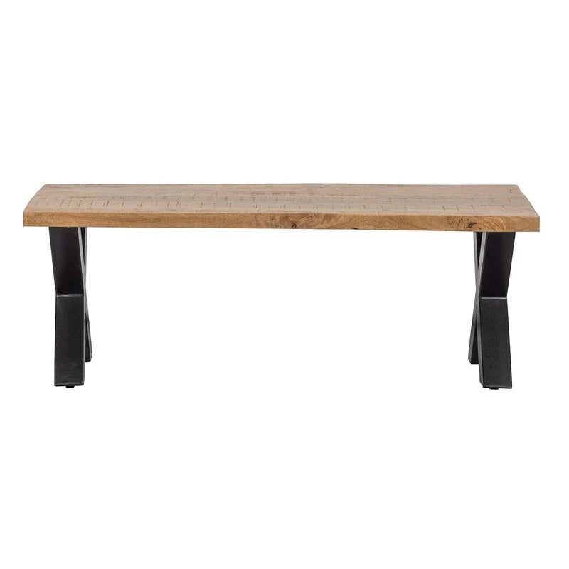 Die Mangoholzplatte ist massiv und hat eine Dicke von etwa 3 Zentimetern. Auf das Mangoholz werden mehrere Schichten Holzöl und ein klares, natürliches Bienenwachs aufgetragen, um das Holz vor Feuchtigkeit, Schmutz und Ringen zu schützen. Die X-Beine bestehen aus schwarz pulverbeschichtetem Metall.