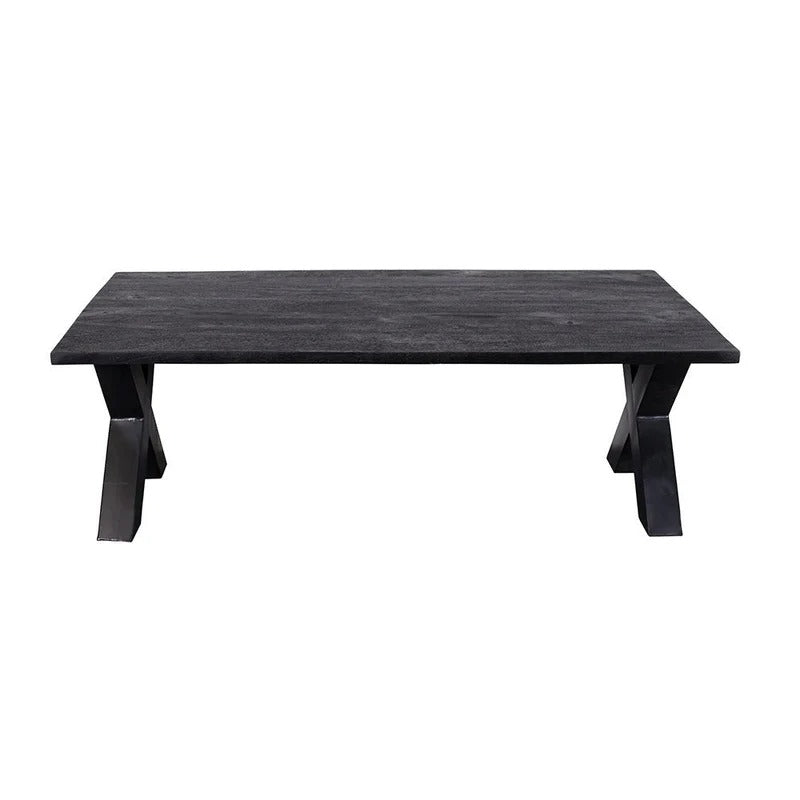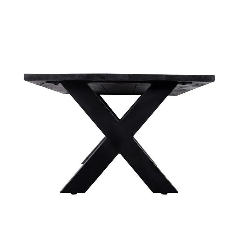 Die Mangoholzplatte ist massiv und hat eine Dicke von etwa 3 Zentimetern. Das Mangoholz wird zunächst sandgestrahlt, anschließend mit schwarzer Beize behandelt und abschließend mit einem dunklen natürlichen Bienenwachs behandelt, um das Holz vor Feuchtigkeit, Schmutz und Flecken zu schützen. Die X-Beine bestehen aus schwarz pulverbeschichtetem Metall.