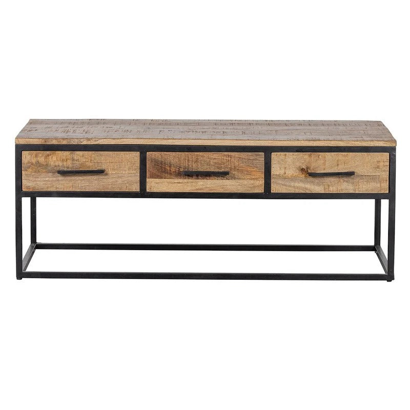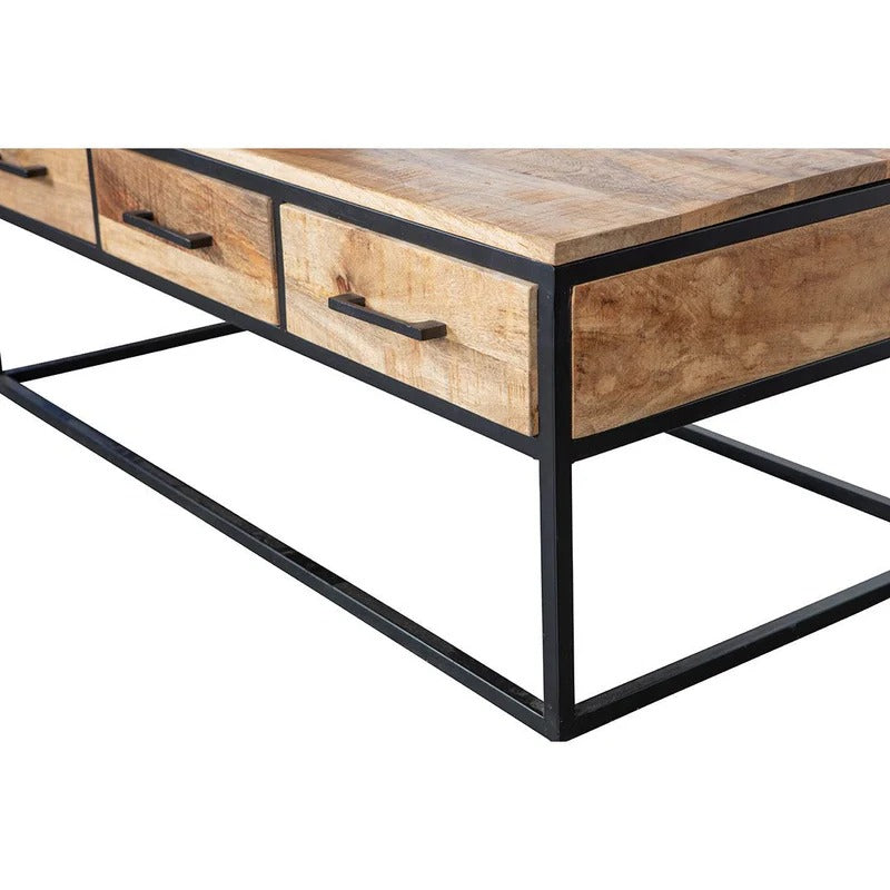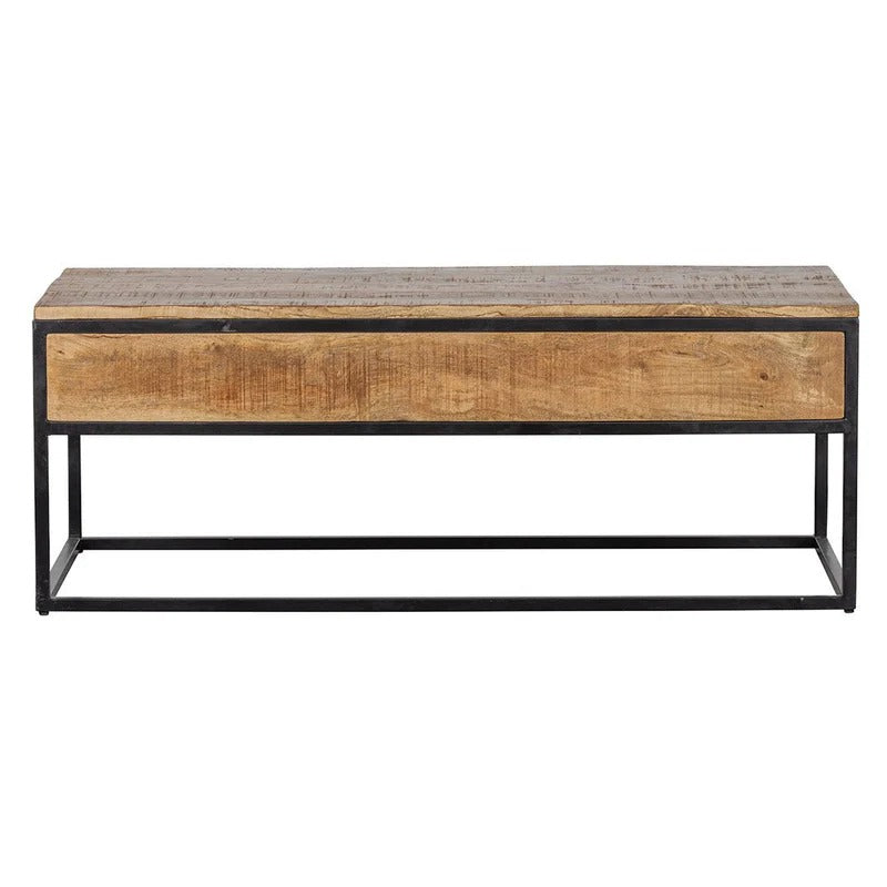 Auf das Holz werden mehrere Schichten Holzöl und ein klares, natürliches Bienenwachs aufgetragen Massives Mangoholz zum Schutz des Holzes vor Feuchtigkeit, Schmutz und Ringen. Der Rahmen und die Griffe bestehen aus schwarz pulverbeschichtetem Metall.