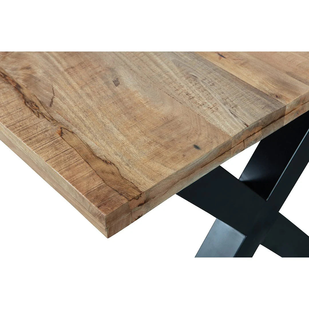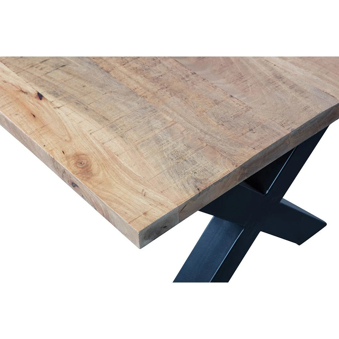 Über das Mangoholz Tragen Sie mehrere Schichten Holzöl und ein klares, natürliches Bienenwachs auf, um das Holz vor Feuchtigkeit, Schmutz und Ringen zu schützen. Die Platte mit einer Stärke von 6 cm besteht aus 3 cm massivem Mangoholz und ist mit einer zusätzlichen Leiste von 3 cm verdickt. Die X-Beine bestehen aus schwarz pulverbeschichtetem Metall und haben einen Abstand von 228 cm zwischen den Beinen.