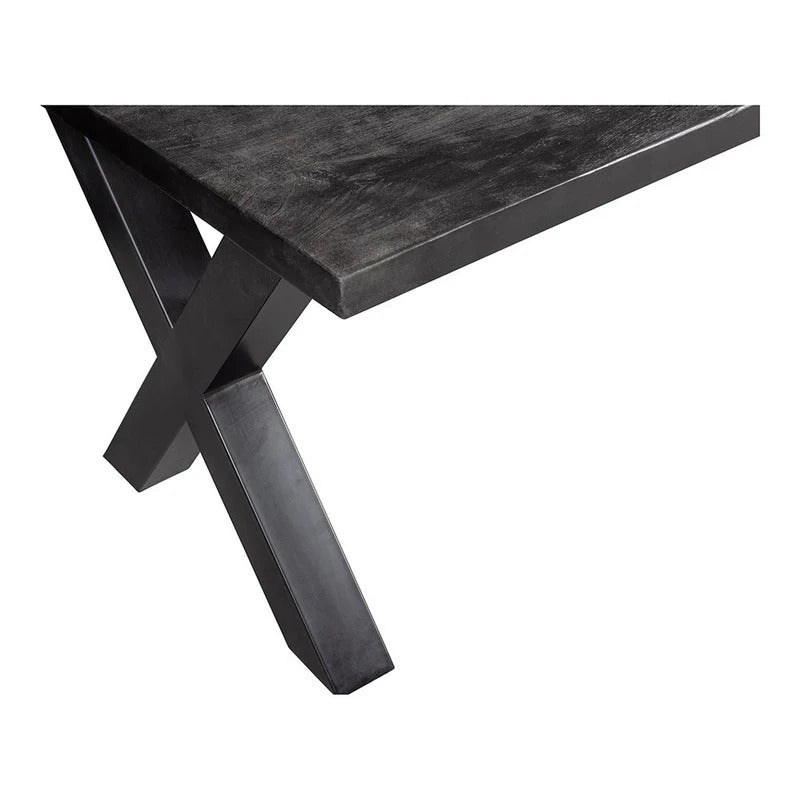 Die Oberseite wird zunächst sandgestrahlt und anschließend mit schwarzer Farbbeize behandelt und wird abschließend mit einem dunklen, natürlichen Bienenwachs veredelt, um das Holz vor Feuchtigkeit, Schmutz und Flecken zu schützen. Die Platte mit einer Stärke von 6 cm besteht aus 3 cm massivem Mangoholz und ist mit einer zusätzlichen Leiste von 3 cm verdickt. Die X-Beine bestehen aus schwarz pulverbeschichtetem Metall und haben einen Abstand von 128 cm zwischen den Beinen.