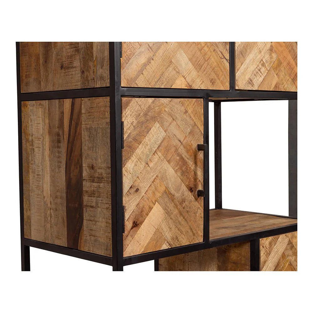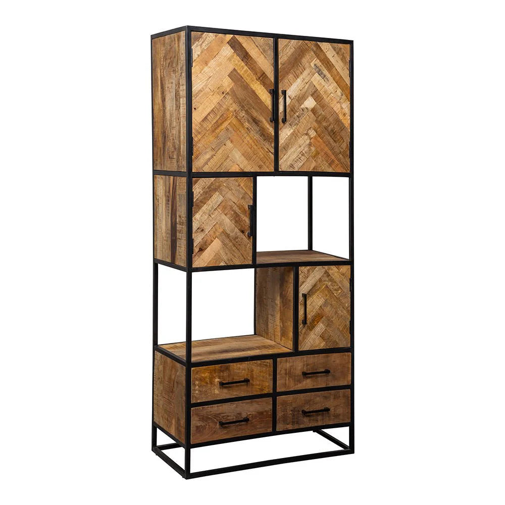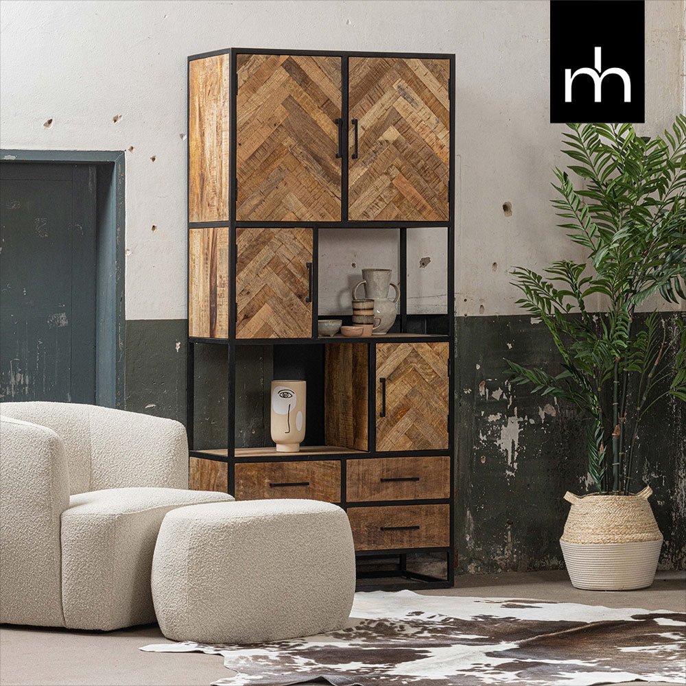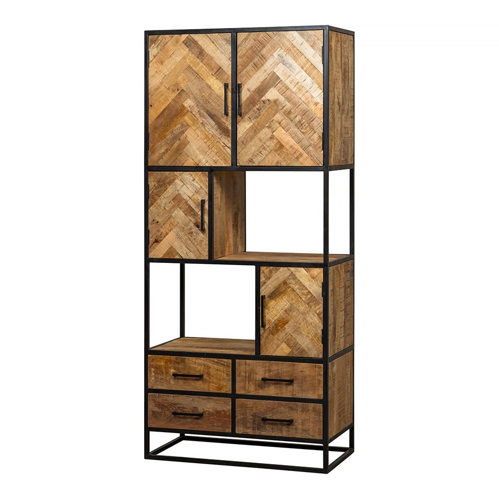 Der kleine Bruder des New Haven XXL Regals hat auch viel Stauraum! Der 90 cm breite Schrank verfügt über eine lockere Aufteilung in offene und geschlossene Fächer und darunter befinden sich vier Schubladen zum Ordnen von Kleinteilen. Die Türen des Schranks haben ein Fischgrätenmuster, das einen eleganten Effekt im Raum erzeugt.