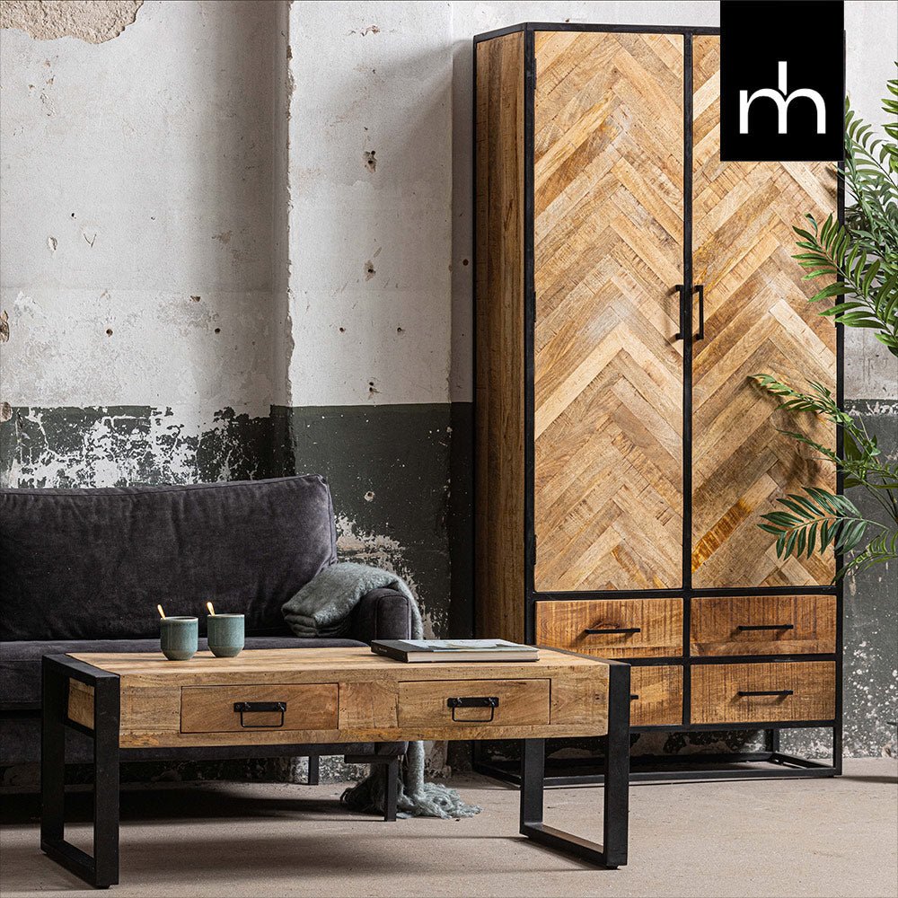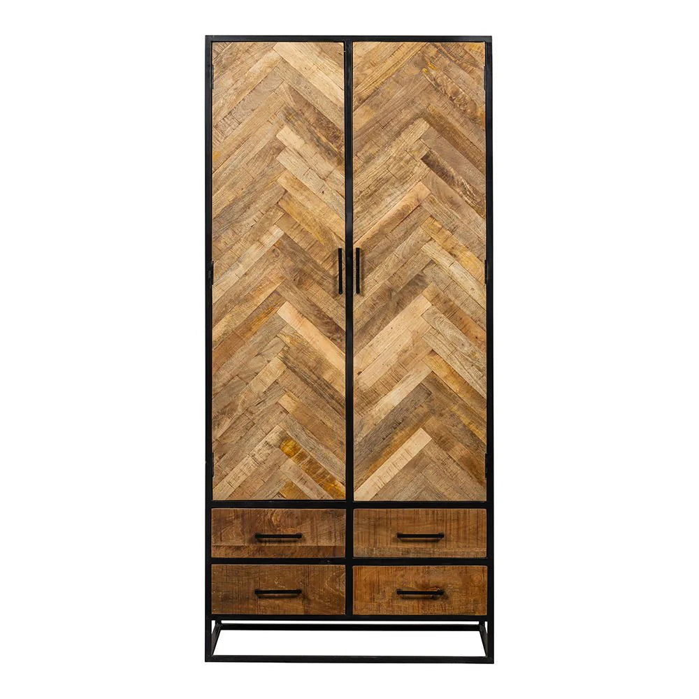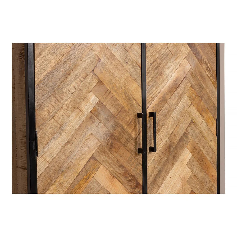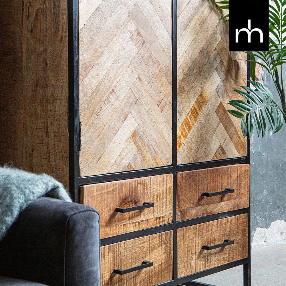 Der geschlossene Wandschrank von New Haven zeichnet sich durch Schönheit aus! Der robusten Kombination aus warmem Mangoholz und Metallakzenten wurde ein stilvolles Fischgrätenmuster hinzugefügt. Das Möbelstück kann in allen Räumen des Hauses nützlich sein und als Bücherschrank, Hauswirtschaftsschrank oder sogar als Garderobe verwendet werden. Hinter den Türen befinden sich drei breite Regale und unten vier Schubladen zur Aufbewahrung aller möglichen Gegenstände.