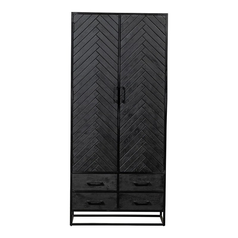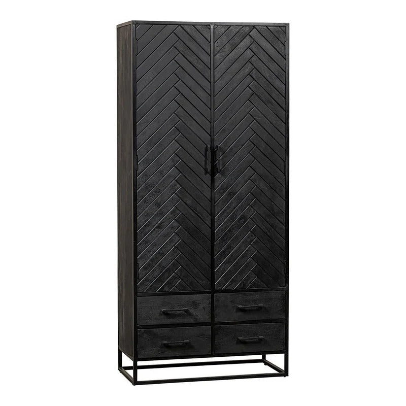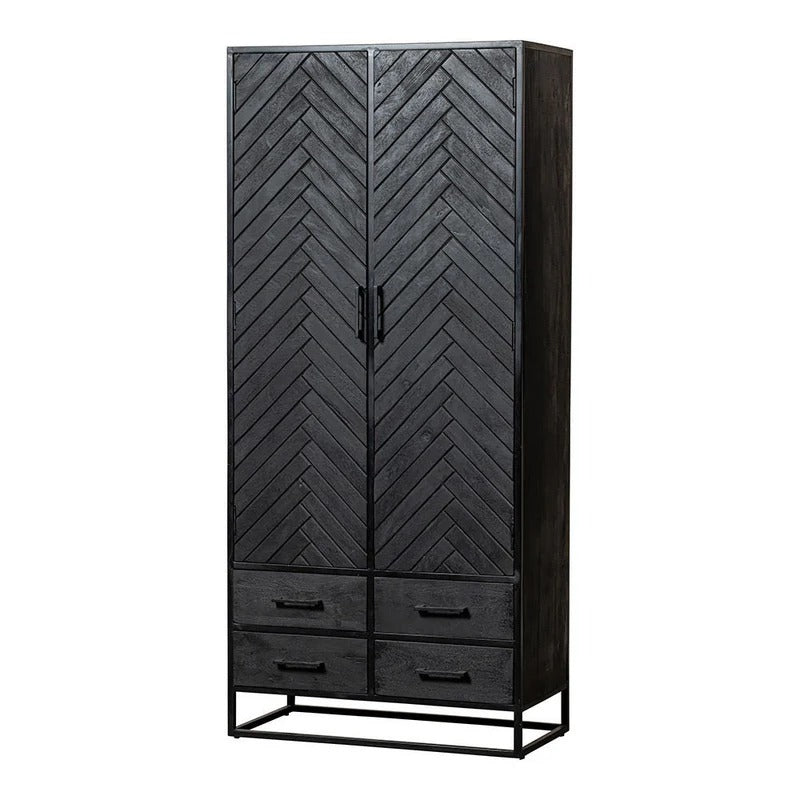 Die Kombination aus Metall, schwarzer Farbe und Fischgrätenmuster macht dieses handgefertigte Möbelstück in jedem Raum sofort auffällig. Der Schrank verfügt über zwei Türen und vier Schubladen. Hinter den großen Türen befinden sich drei Regale, die ausreichend Stauraum für allerlei Dinge bieten. Das Möbel ist sehr multifunktional und kann als Kleiderschrank, Anrichte verwendet werden oder als Bücherschrank, sodass der Schrank in jedem Raum des Hauses nützlich sein kann!