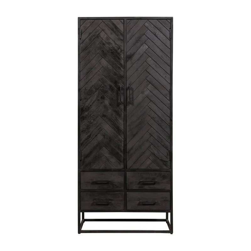 Der wunderschöne Schrank Toronto schwarz fällt sofort jedem ins Auge. Dieser schwarze Schrank hat ein Fischgrätenmuster, das dem Schrank einen sehr schicken Charakter verleiht, sodass die Möbel in keinem Raum fehl am Platz wirken. Der Schrank besteht aus vier Schubladen unten und zwei großen Fächern hinter den Türen, in denen allerlei Dinge aufbewahrt werden können.