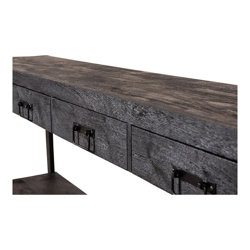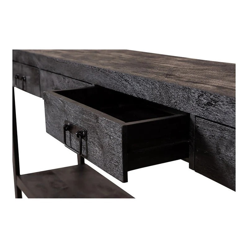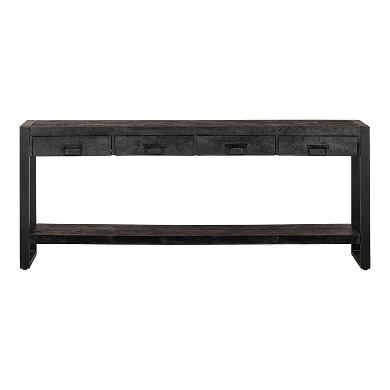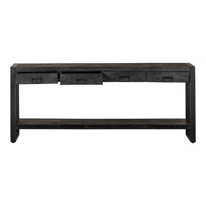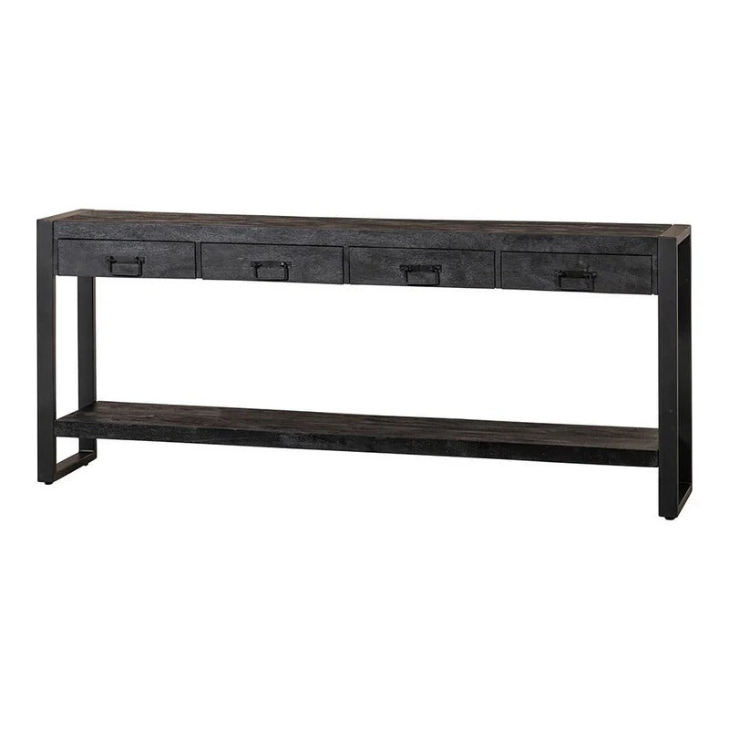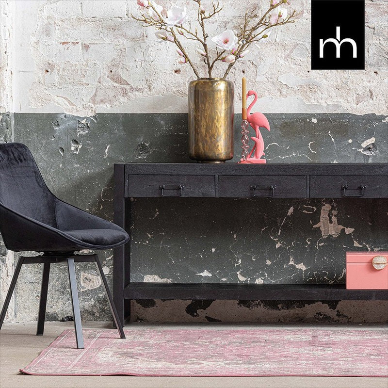 Das Mangoholz ist massiv und is zuerst sandgestrahlt, danach welches mit schwarzer Farbbeize behandelt und abschließend mit einem dunklen, natürlichen Bienenwachs veredelt wird, um das Holz vor Feuchtigkeit, Schmutz und Kreisen zu schützen. Die Rahmen und die Griffe bestehen aus schwarz pulverbeschichtetem Metall.