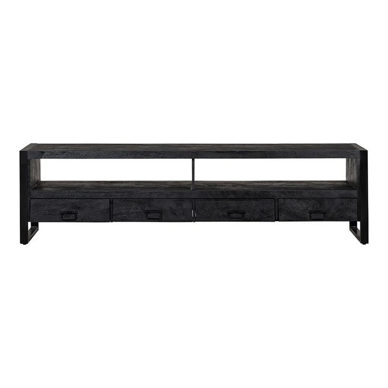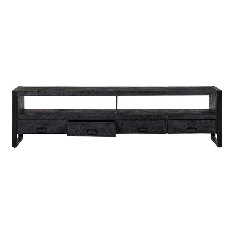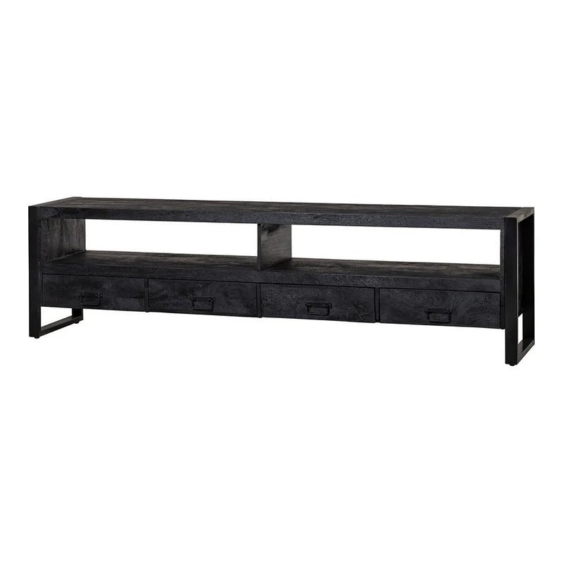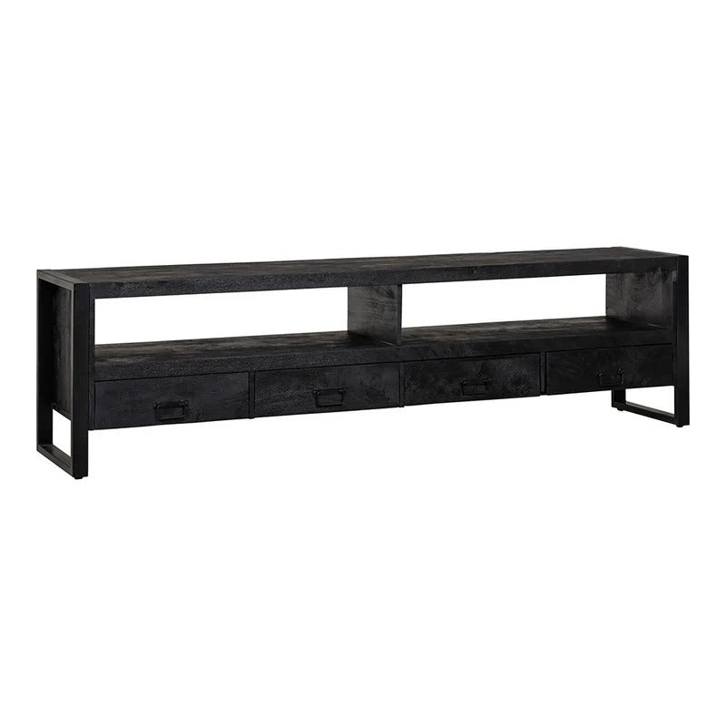 Die größte Variante der Britt schwarz-Kollektion! Mit seiner Breite von 220 cm ist das Möbelstück ein echter Hingucker im Wohnzimmer. Dank des schwarzen Mangoholzes und der schwarzen Metallelemente bilden die Möbel ein elegantes Ganzes, das in Ihrem Zuhause den Ton angibt! Das Möbel ist ideal für die Platzierung eines großen Fernsehers und verfügt außerdem über ein geräumiges offenes Fach mit vier Schubladen darunter zur Aufbewahrung von Zubehör.