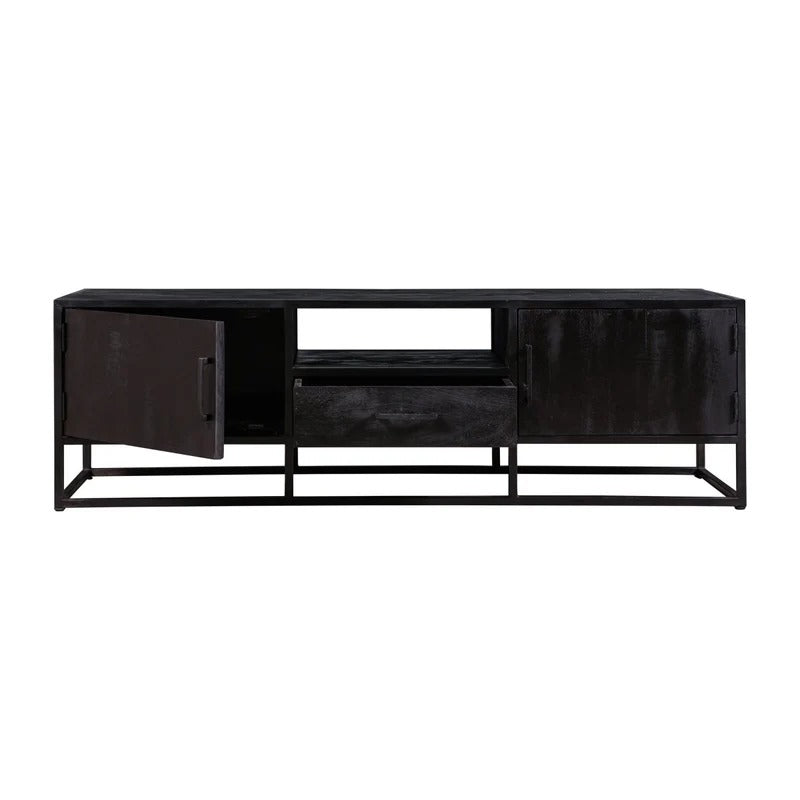 Das Mangoholz ist massiv und wird zunächst sandgestrahlt, anschließend mit schwarzer Beize behandelt und abschließend mit einem dunklen, natürlichen Bienenwachs veredelt, um das Holz vor Feuchtigkeit, Schmutz und Flecken zu schützen. Das Gestell und die Griffe bestehen aus schwarz pulverbeschichtetem Metall.