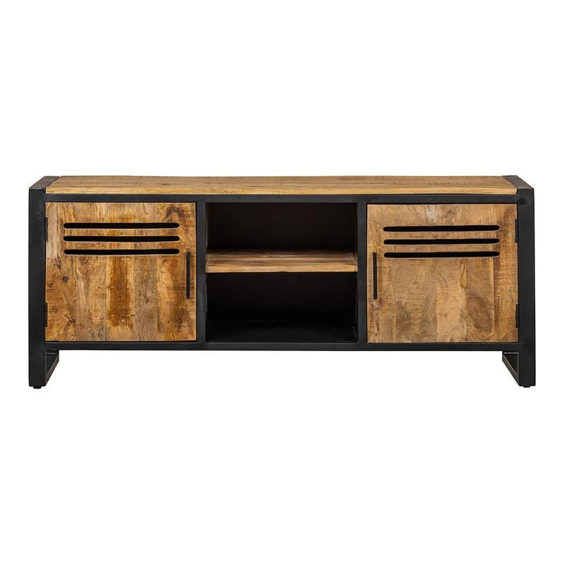 Die Henderson TV-Möbel sind vom bekannten Spindschrank inspiriert. Die Möbel sind eine stabile Kombination aus Mangoholz und schwarzem Stahl.