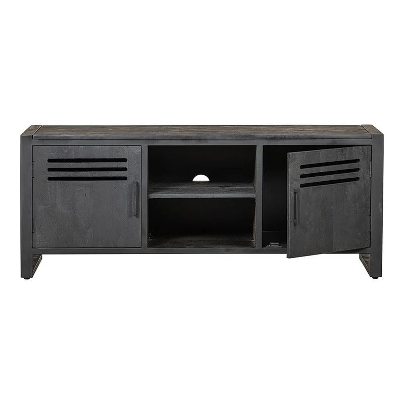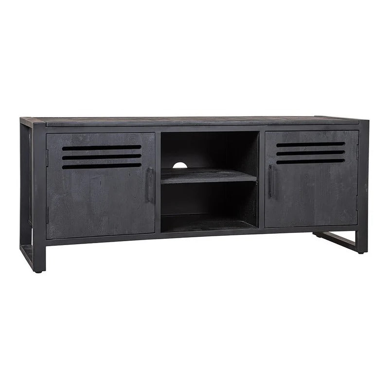 Der TV-Schrank Henderson, inspiriert von den bekannten Schließfachschränken der Vergangenheit, ist durch die Kombination aus schwarzem Mangoholz und Stahl eine robuste und robuste Ergänzung für Ihr Wohnzimmer Einzelheiten. Hinter den Türen und auf den Regalen ist genügend Platz, um alles zu verstauen.