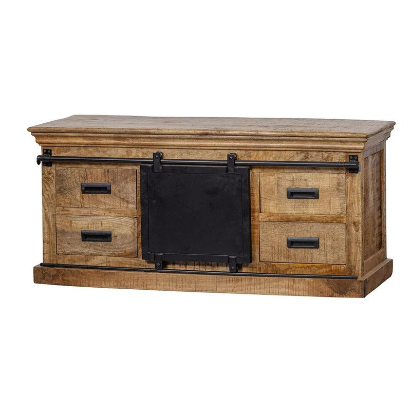 Der kleinste Fernsehschrank aus der Portland-Kollektion ist gemütlich und warm, wirkt aber durch das warme Mangoholz mit den schwarzen Metalldetails dennoch robust und kraftvoll . span>Das Möbel verfügt dank der vier Schubladen und dem Platz hinter der schwarzen Stahlschiebetür über ausreichend Stauraum.