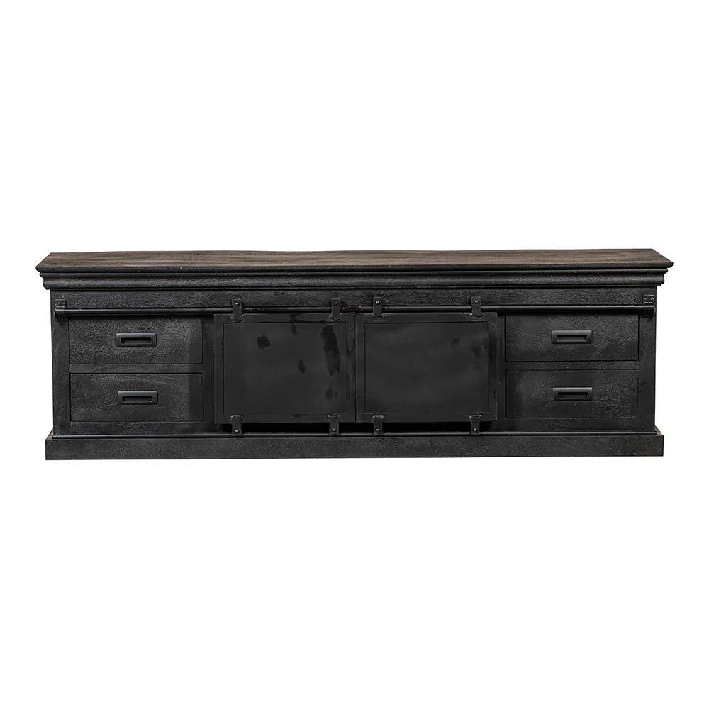 Auf das massive Mangoholz werden mehrere Schichten Holzöl und ein klares, natürliches Bienenwachs aufgetragen, um das Holz vor Feuchtigkeit und Schmutz zu schützen und Markierungen. Die Schiebetüren, Schienen und Griffe bestehen aus schwarz pulverbeschichtetem Metall.