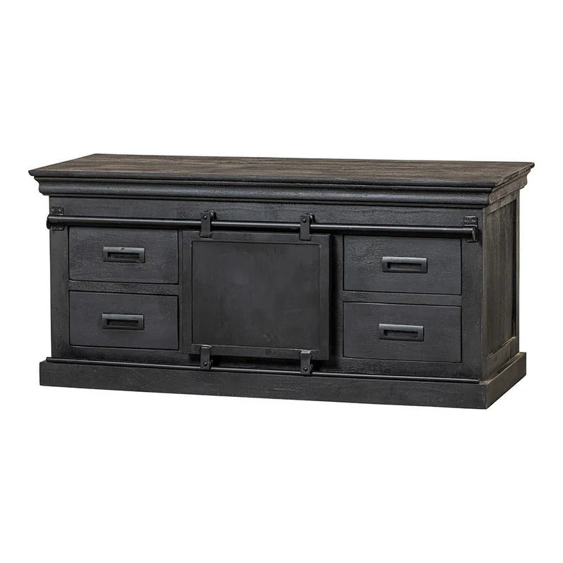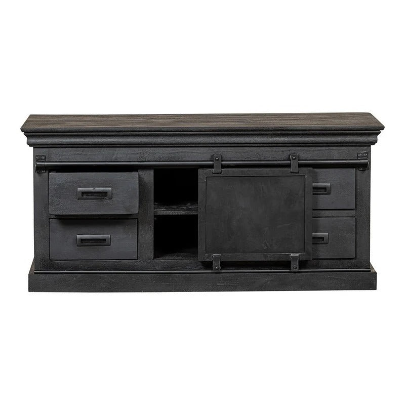 Das Mangoholz ist massiv und is Zunächst wird es sandgestrahlt, anschließend mit schwarzer Farbbeize behandelt und schließlich mit einem dunklen, natürlichen Bienenwachs veredelt, um das Holz vor Feuchtigkeit, Schmutz und Flecken zu schützen. Die Schiebetür, Schienen und Griffe bestehen aus schwarz pulverbeschichtetem Metall.