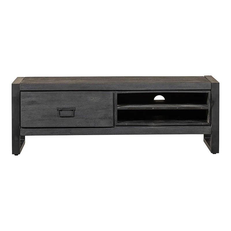 Die kleinste Version der Stockton schwarz TV-Möbel ist ein stabiler Schrank aus massivem Mangoholz und schwarzen Stahlakzenten. Das schwarze Mangoholz verleiht den Möbeln ein schickes, aber auch robustes Aussehen. Im offenen Fach ist ausreichend Platz für einen Verstärker oder einen Router. Die tiefe Schublade bietet zusätzlichen Platz zum Verstauen Ihrer Sachen.
